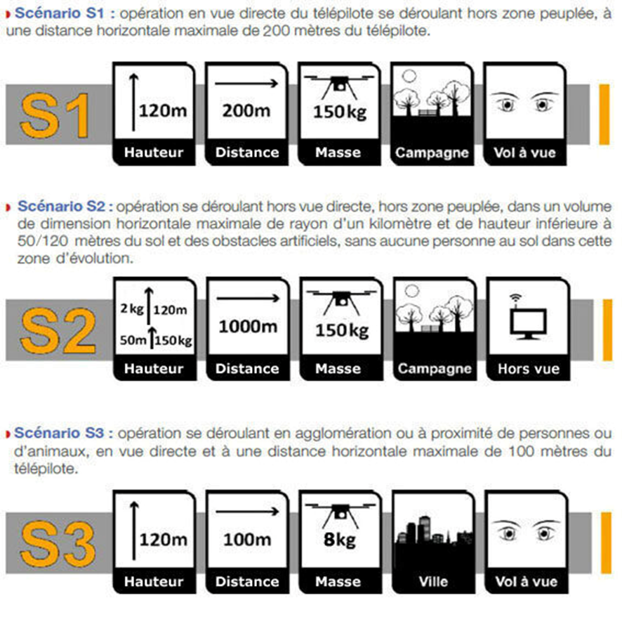 Dans le cadre de certains scénarios et en fonction de la masse, des équipements peuvent être obligatoires, tels que : dispositif de protection des tiers, dispositif automatique empêchant de dépasser une altitude ou hauteur maximale programmable, dispositif d’information sur le positionnement et le déplacement de l’aéronef (obligatoire en S-2), dispositif automatique empêchant de franchir les limites horizontales d’un volume de vol programmable (obligatoire en S-2), mécanisme d’arrêt de la propulsion en vol indépendant des automatismes embarqués de contrôle de la trajectoire (obligatoire en S-2), enregistreur embarqué des paramètres essentiels du vol (obligatoire en S-2), dispositif signalant par une alarme sonore la chute de l’aéronef, etc…